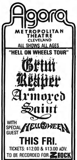 - 11/01/1985; Concert at The Agora Ballroom, Hartford, CT, USA. opening for Metallica & W.A.S.P.