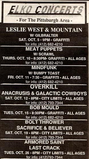 - 26/10/1991; Concert at City Limits, Pittsburgh, PA, USA. with Wrathchild America & Last Crack.