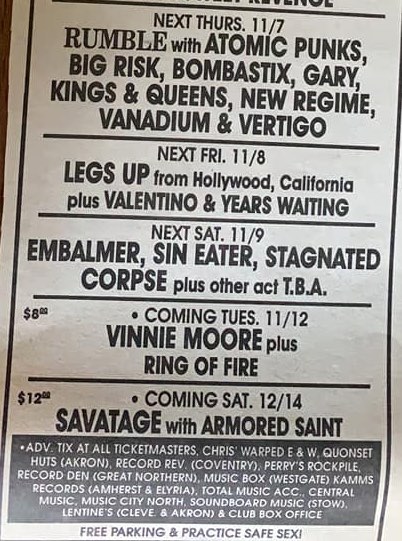 - 13/12/1991; Concert at Flash's, Cleveland, OH, USA. opening for Savatage.