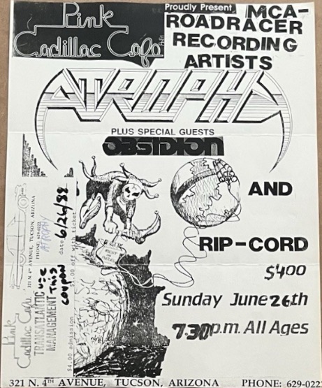 - 26/02/1988; Concert at The Pink Cadillac, Tucson, AZ, USA. opening for Aftermath, with Obsidian.