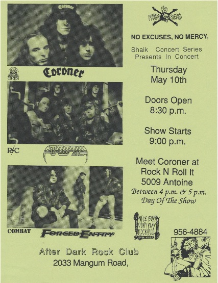 - 10/05/1990; Concert at After Dark, Houston, TX, USA. opening for Coroner, with Forced Entry.