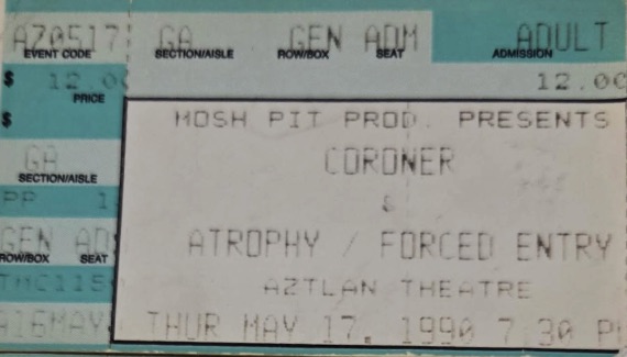 - 17/05/1990; Concert at The Aztlan Theatre, Denver, CO, USA. opening for Coroner, with Forced Entry & Sinister Creed.