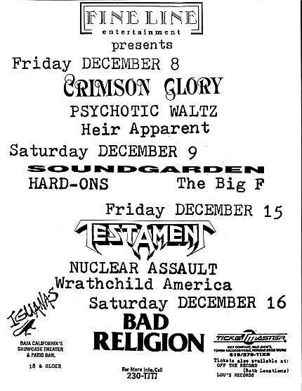 - 14/02/1986; Concert at Fender's Ballroom, Long Beach, CA, USA. opening for Circle Jerks & Gang Green, with Insolents.