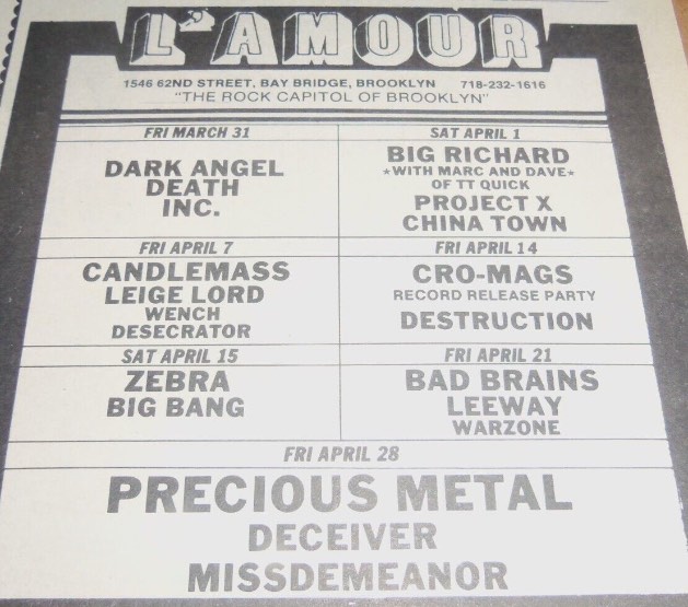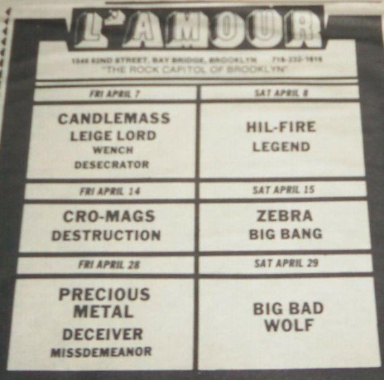 - 07/04/1989; Concert at L'Amour, Brooklyn, NY, USA. with Liege Lord, Wench & Desecrator.
