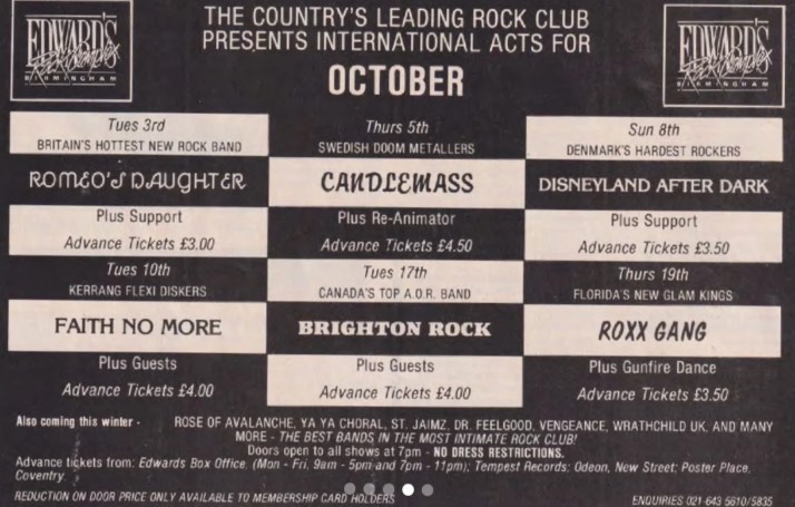 - 05/10/1989; Concert at Edwards No.8, Birmingham, England. with Re-Animator.