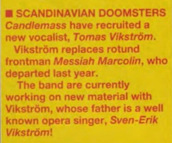 - ??/02/1992; Candlemass find a new singer early in '92; Tomas.
