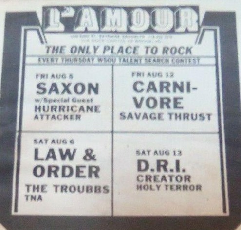 - 19/01/1985; Concert at L'Amour, Brooklyn, NY, USA. opening for Anvil.