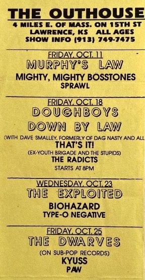 - 23/10/1991; Concert at The Outhouse, Lawrence, KS, USA. opening for The Exploited & Biohazard.