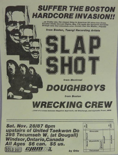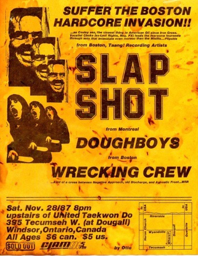 - 28/11/1987; Concert at Upstairs of United Taekwon Do, Windsor, ON, Canada. opening for Slap Shot, with Wrecking Crew.