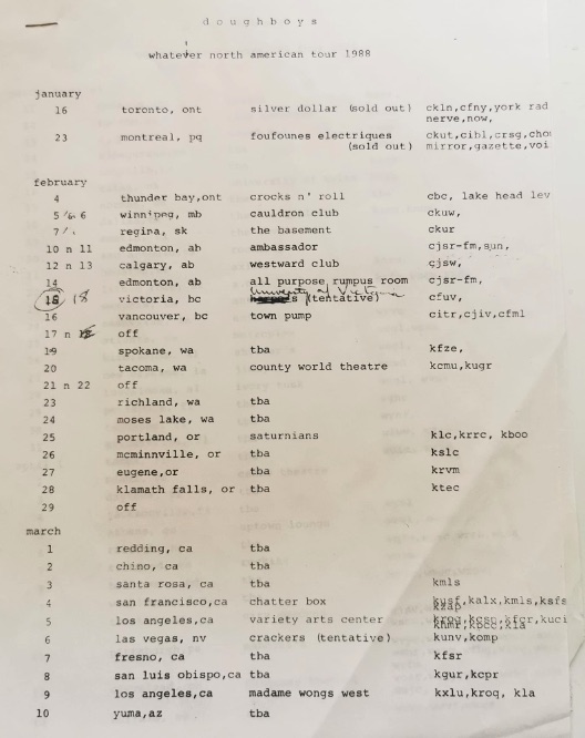 - 10/02/1988; Concert at The Ambassador Tavern, Edmonton, AB, Canada. opening for Tupelo Chain Sex.