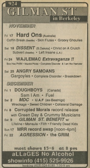 - 01/08/1987; Concert at 924 Gilman Street, Berkeley, CA, USA. with Vampire Lesbos, Operation Ivy & asst.