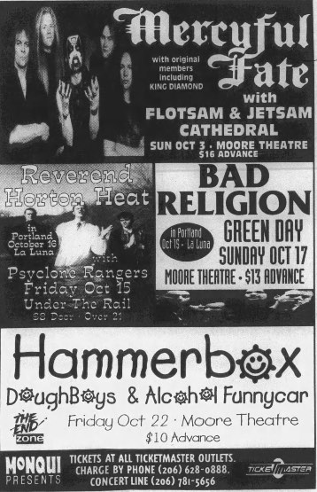 - 25/02/1988; Concert at The Satyricon, Portland, OR, USA. opening for Oily Bloodmen, with Zoo Morphics.