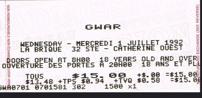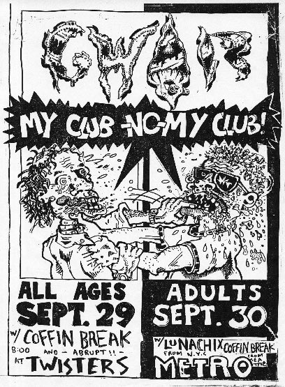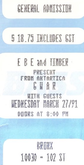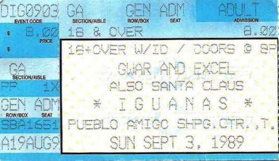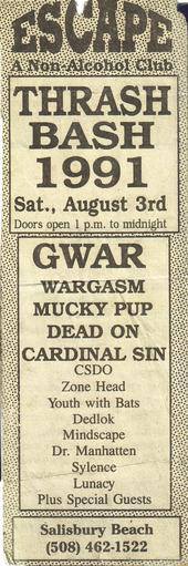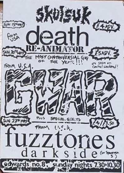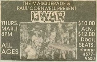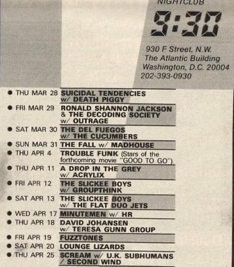 - 28/03/1985; Concert at The 9:30 Club, Washington, DC, USA. opening for Suicidal Tendencies & Death Piggy. (1st show, short set as 'Gwaarggh').