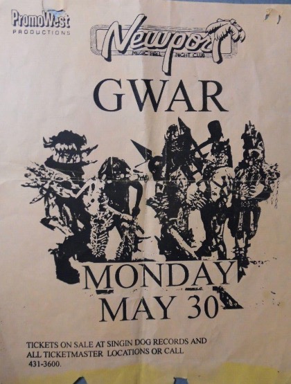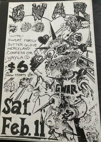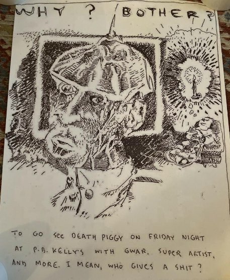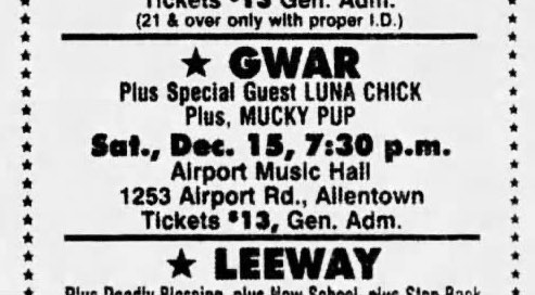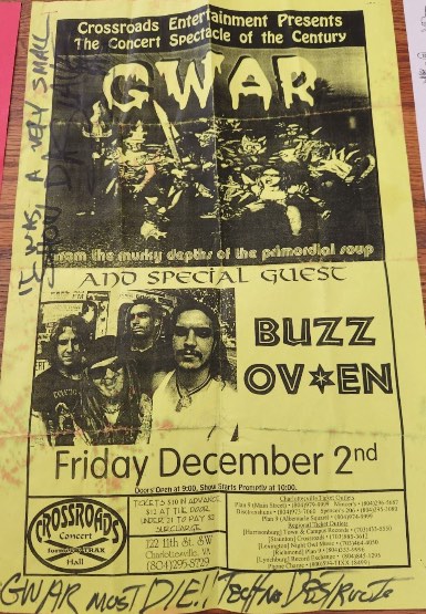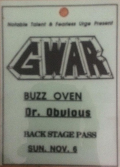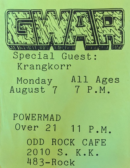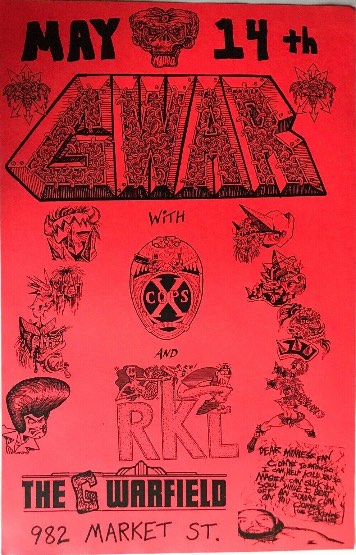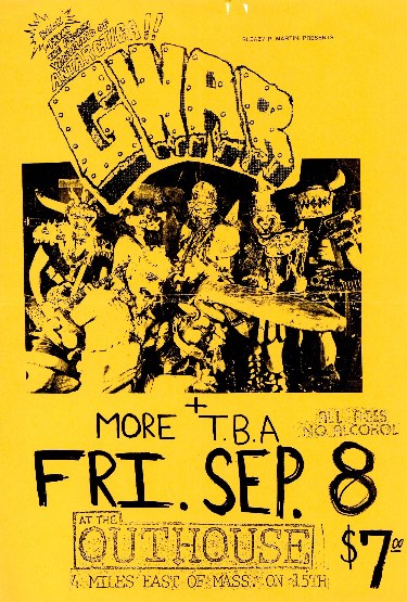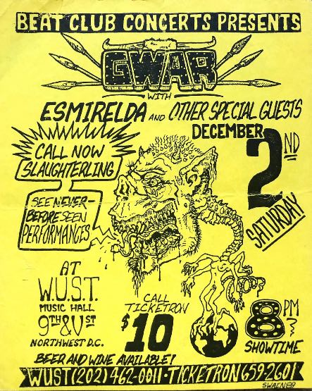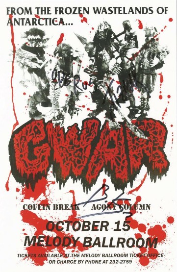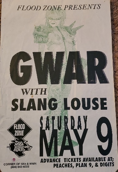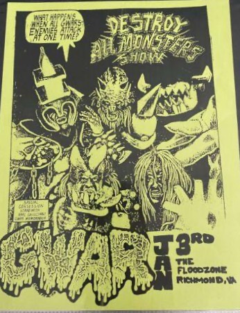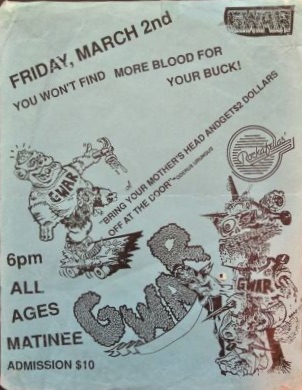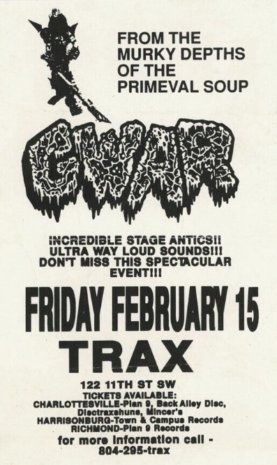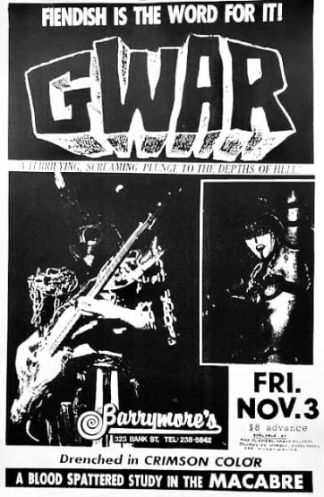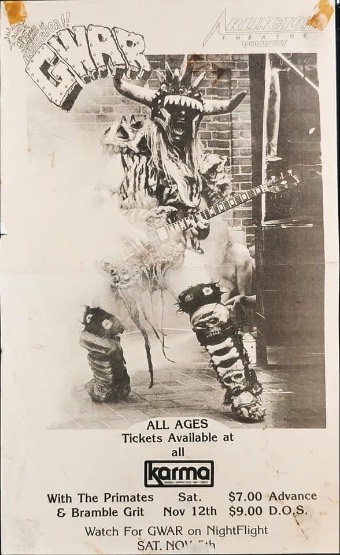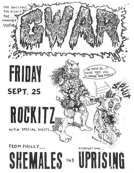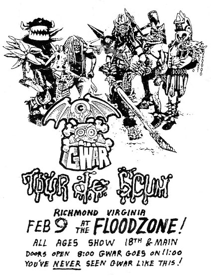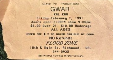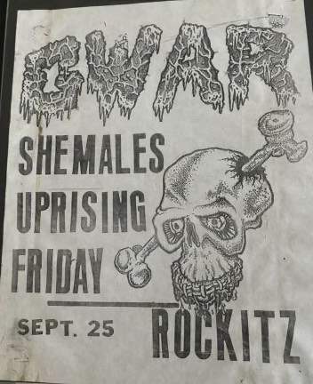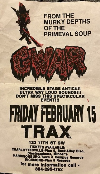 - 11/10/1985; Concert at P.B. Kellys, Richmond, VA, USA. opening for Death Piggy. (as 'Gwar' by now).