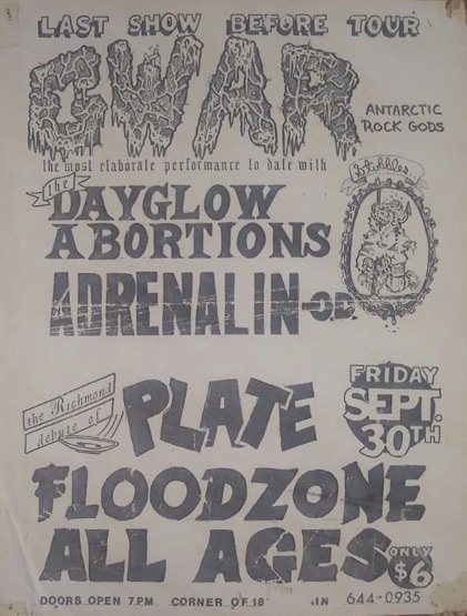 - 30/09/1988; Concert at Floodzone, Richmond, VA, USA. with Dayglo Abortions & Adrenalin O.D.
