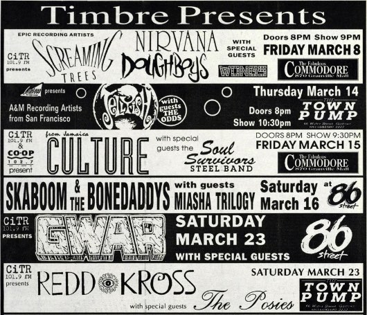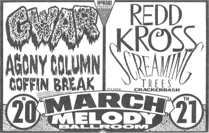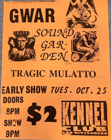 - 25/10/1988; Concert at The Kennel Club, San Francisco, CA, USA. with Soundgarden & Tragic Mulatto.