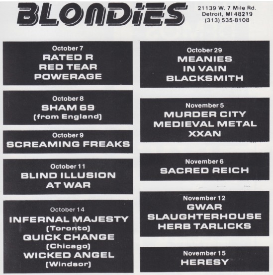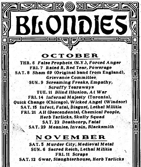 - 15/11/1988; Concert at Blondie's, Detroit, MI, USA. with Forced Anger & Herb Tarlicks. (moved from 12/11).