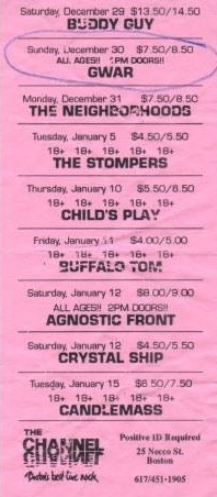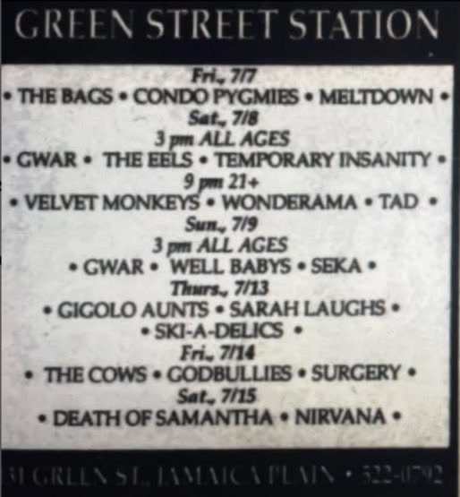 - 12/06/1988; Concert at Green St. Station, Boston, MA, USA. with Eel Well Babies. (9:00 show).