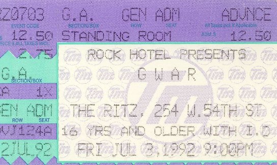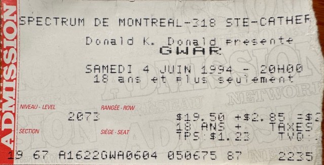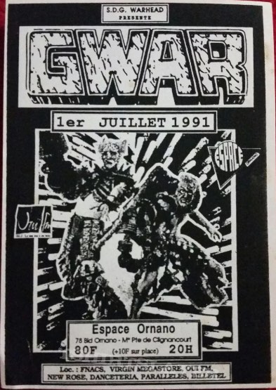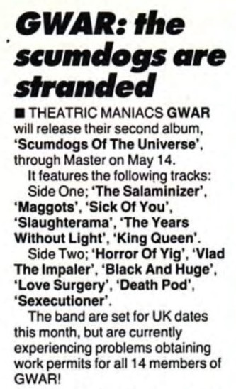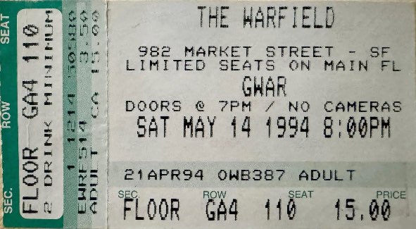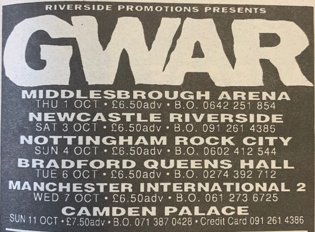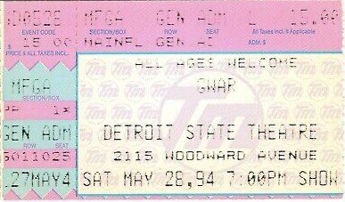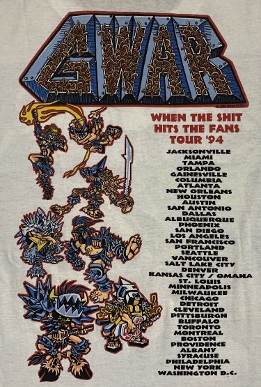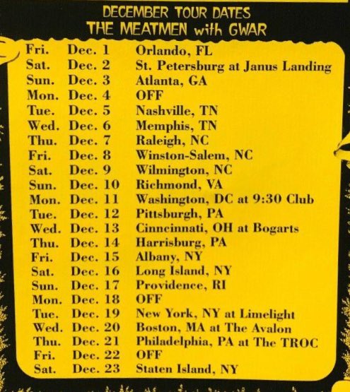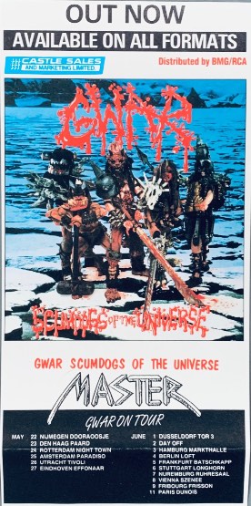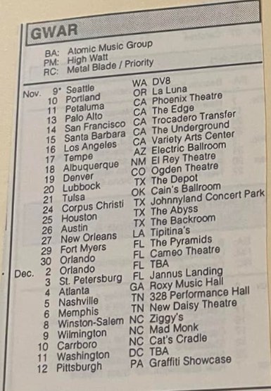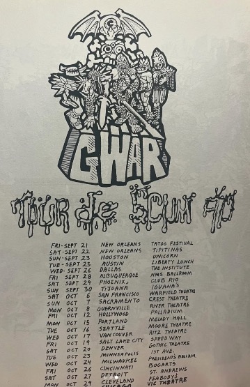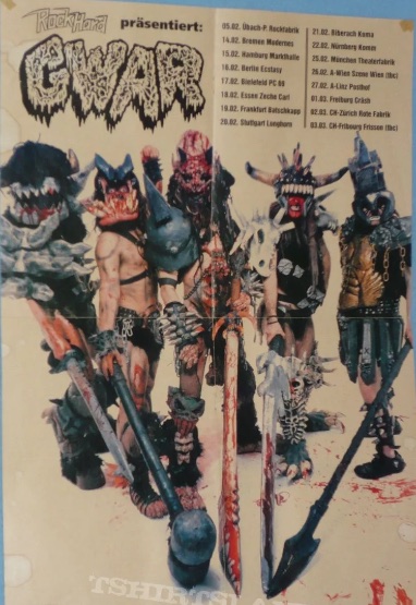- ??/04/1997; GWAR tour U.S. from Apr. - Jun. and Jul./Aug. before a European tour in Sep. then U.S. again in Oct./Nov., dates to follow