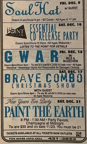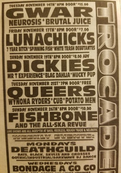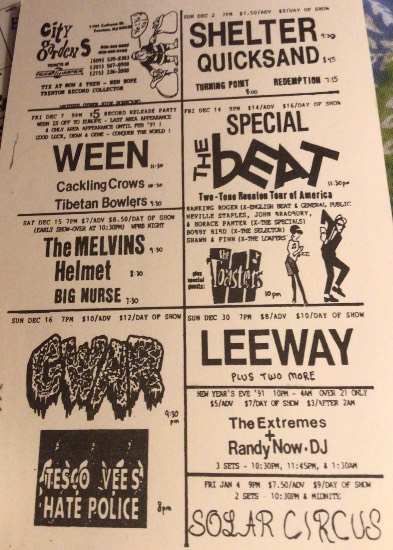 - 17/12/1987; Concert at Rockitz, Richmond, VA, USA. opening for Butthole Surfers.