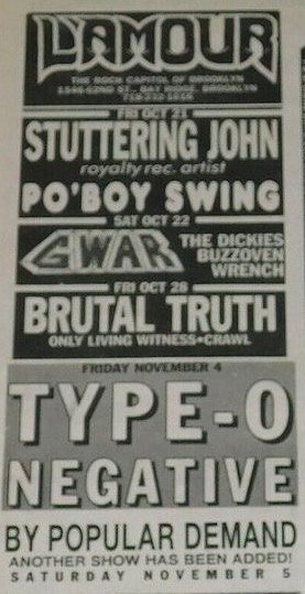 - 15/12/1995; Concert at Saratoga Winners, Cohoes, NY, USA. with The Meatmen & Brutal Juice.