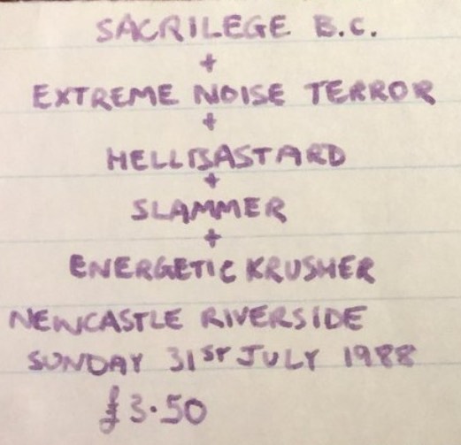 - 31/07/1988; Concert at The Station Club, Newcastle, England. opening for Extreme Noise Terror, with Hellbastard & asst.