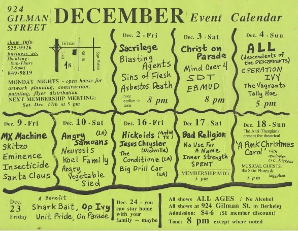 - 09/02/1990; Concert at 924 Gilman Street, Berkeley, CA, USA. with Hell's Kitchen & asst. (show moved).