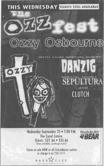 - 25/09/1996; Concert at Corel Centre, Ottawa, ON, Canada. opening for Ozzy, with Danzig & Prong.