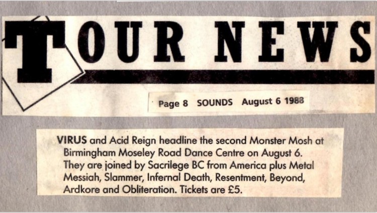 - 06/08/1988; Concert at Mosely Road, Birmingham, England. with Acid Reign, Virus, Sacrilege B.C. & asst.
