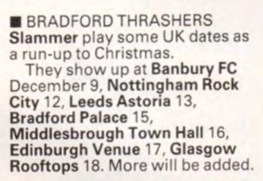 - 19/12/1988; Concert at The Queens Hall, Bradford, England. opening for Onslaught & The Crumbsuckers.