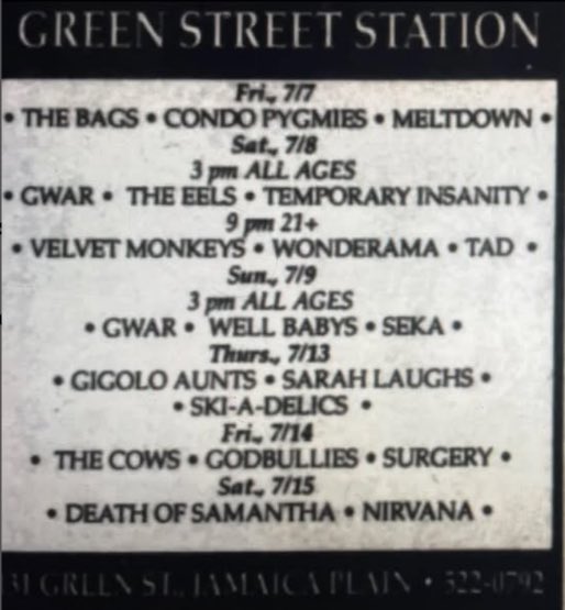 - 08/07/1989; Concert at Green Street Station, Jamaica Plains, MA, USA. opening for Velvet Monkeys & Wonderama.