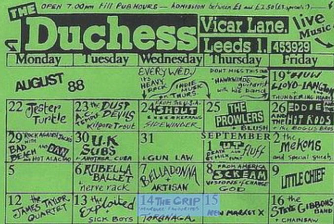 - 14/09/1988; Concert at The Duchess Of York, Leeds, England. opening for The Grip.