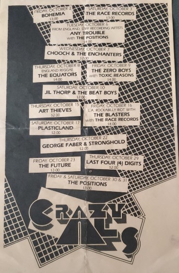 - 09/10/1981; Concert at Crazy Al's, Indianapolis, IN, USA. opening for Zero Boys.