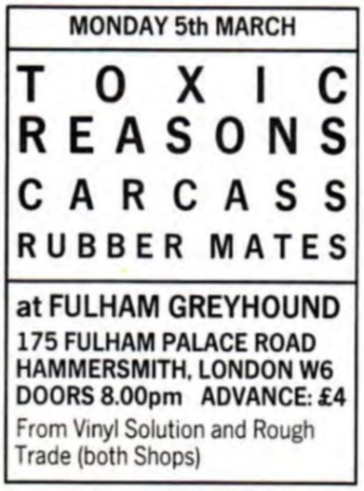 - 05/03/1990; Concert at Fulham Greyhound, London, England. with Carcass & Rubber Maids.