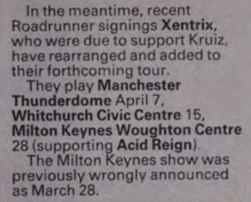 27/03/1989; Concert at The Woughton Center, Milton Keynes, England. opening for Acid Reign. (was 28/04 actually).