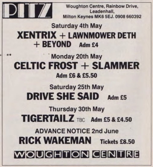- 04/05/1990; Concert at The Woughton Centre, Milton Keynes, England. with Lawnmower Deth & The Beyond.