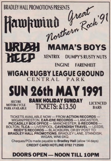 - 26/05/1991; Concert at Central Park, Wigan, England. opening for Hawkwind, Uriah Heep & asst.