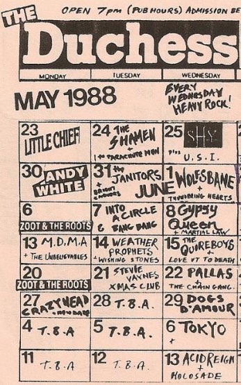 - 19/07/1988; Concert at The Boston Arms, London, England. with Holosade. (moved from Fulham Greyhound).
