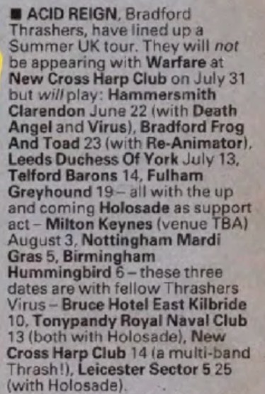 - ??/??/1987; mid '87 Acid Reign form, H (v), Ramsey (d), Gaz (g), Ian (b).