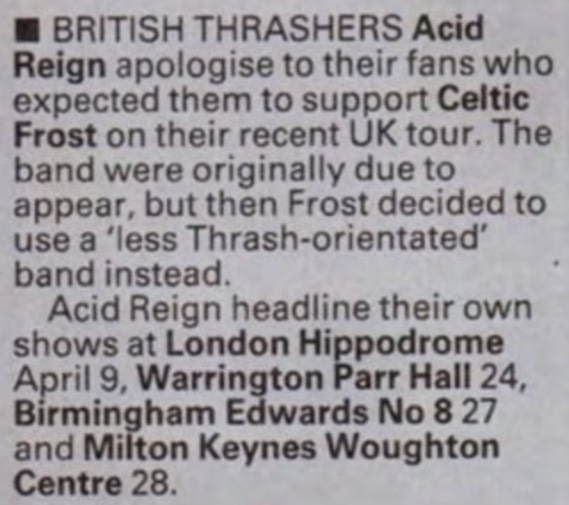 - 04/05/1991; In an announcement in Kerrang Acid Reign confirm they have decided to split. a proposed live album/video is scrapped.