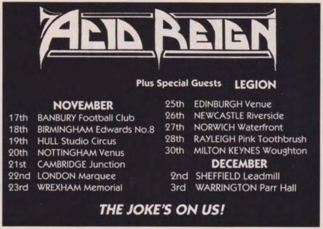 - 17/11/1990; Concert at Banbury F.C., Banbury, England. with Legion. (Nov. 17th - Dec. 3rd; 'The Jokes On Us' tour).