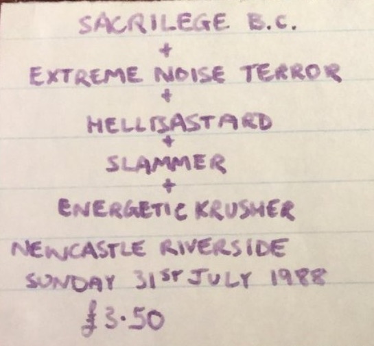 - 31/07/1988; Concert at The Station Club, Newcastle, England. opening for Extreme Noise Terror, Sacrilege B.C. & Hellbastard.