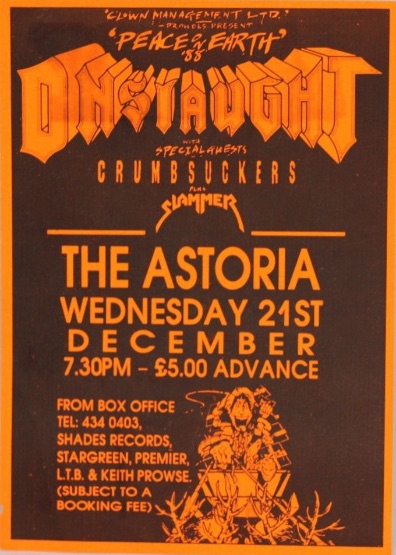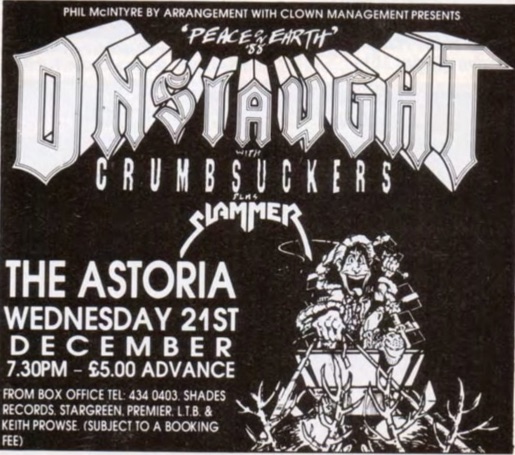 - 21/12/1988; Concert at The Astoria Theatre, London, England. opening for Onslaught & The Crumbsuckers.