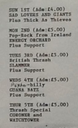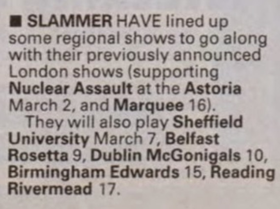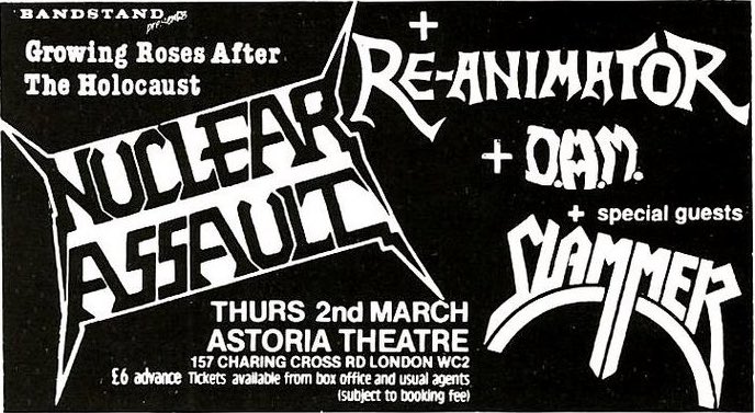 02/03/1989; Concert at The Astoria Theatre, London, England. opening for Nuclear Assault & Re-Animator. (moved to 06/03).