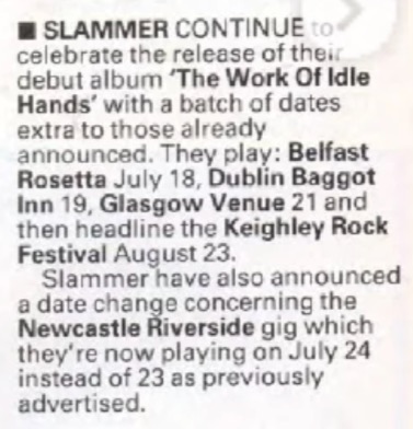 - 24/07/1989; Concert at The Riverside, Newcastle, England. with Hellbastard. (moved from 23rd).