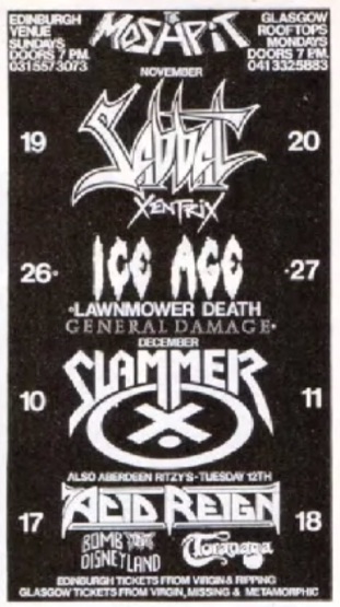 - 18/12/1988; Concert at The Barrowlands, Glasgow, Scotland. opening for Onslaught & The Crumbsuckers.