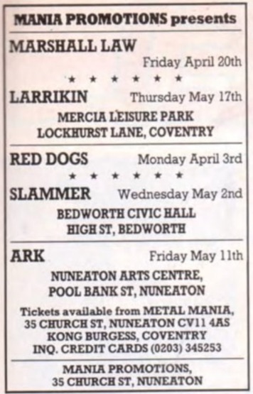 - 22/12/1987; Concert at The Kibbutz, Halifax, England. opening for Lord Crucifer, with Deadline. (2nd ever show!).