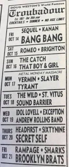 - 17/10/1983; Concert at The Troubadour, Hollywood, CA, USA. opening for Vermin, with Tyrant.