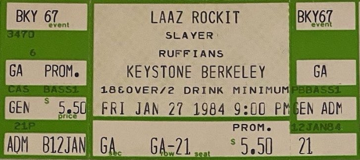 - 27/01/1984; Concert at The Keystone, Berkeley, CA, USA. opening for Laaz Rockit, with Ruffians.