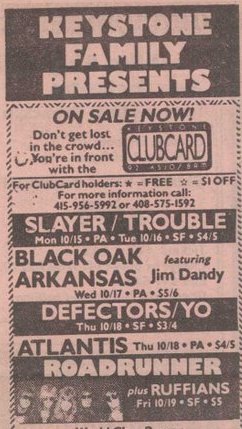 - 23/05/1984; Concert at The Keystone, Berkeley, San Francisco, CA, USA. with Death Angel.